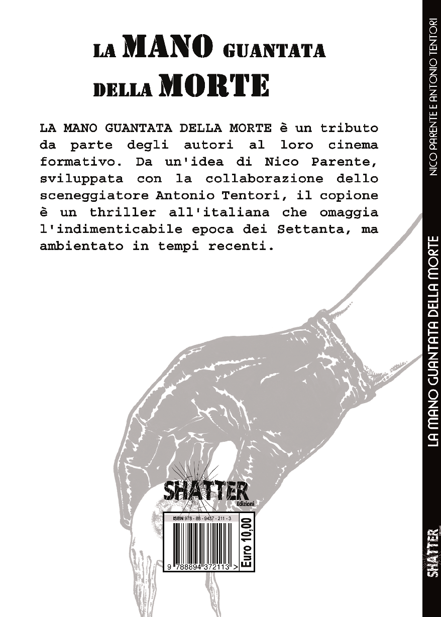 LA MANO GUANTATA DELLA MORTE è una sceneggiatura nata da un’idea di Nico Parente, vede la partecipazione del noto sceneggiatore Antonio Tentori ed è un tributo al loro cinema formativo. Il copione è un thriller all’italiana che omaggia l’indimenticabile epoca dei settanta-ottanta, ma ambientato ai giorni nostri.